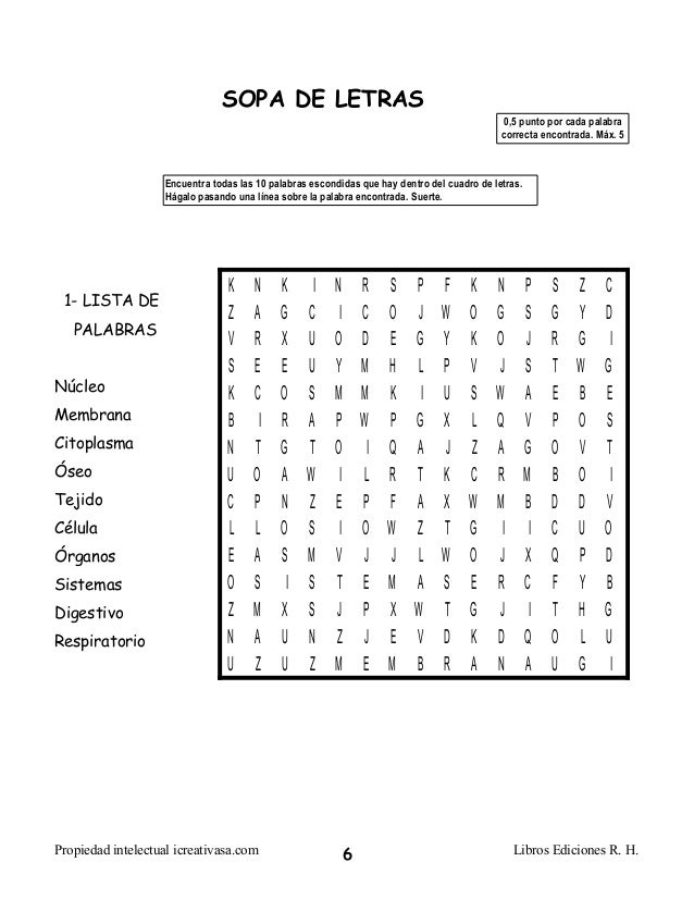 sopa de letras de las partes de la célula - Brainly.lat Sopa de letras de las partes de la célula . trinidadfernanda572 está esperando tu ayuda. Añade tu respuesta y gana puntos. 40 Sopas de letras de Ciencias Naturales, Biología y Geología (upv.es ... 40 sopas de letras, la tierra, animales, plantas, célula, planeta tierra, hongos, líquenes, sustancias puras, mezclas, residuos, funciones de relación, nutrición, diversidad, ecosistemas, coordinación, relación, reproducción, rocas, aparato digestivo, aparato respiratorio, aparato circulatorio, huesos, músculos, sistema nervioso, hormonas,