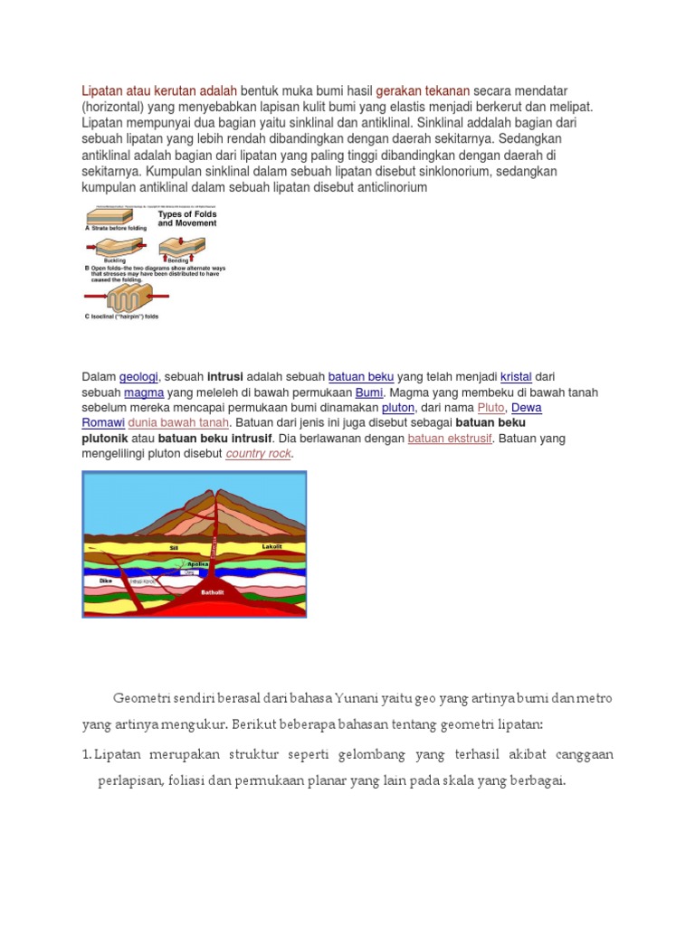 Pengertian Tektonisme, Gerak Epirogenesa Orogenesa ... - materiedukasi.com Gerak orogenetik adalah gerakan yang relatif lebih cepat daripada gerak epirogenetik. Gerak ini disebut gerakan pembentuk pegunungan. Gerakan ini menyebabkan tekanan horizontal dan vertikal di kulit bumi, yang menyebabkan peristiwa dislokasi atau berpindah-pindahnya letak lapisan kulit bumi. Peristiwa tersebut dapat menimbulkan lipatan dan patahan. Gerakan tekanan horizontal yang menyebabkan lapisan kulit bumi berkerut ... Pembahasan Lipatan adalah bentuk gelombang pada suatu lapisan kulit bumi karena terdapat tekanan horizontal maupun vertikal pada kulit bumi yang bersifat liat (plastis). Lipatan terbentuk karena pergeseran lempeng tektonik (Diatropisme). Diatropisme/Tektonisme/Tektogenesa - Materi Geografi Gerakan tekanan horizontal menyebabkan lapisan kulit bumi yang elastis berkerut, melipat, dan menyebabkan relief-relief muka bumi berbentuk pegunungan. Contoh: Pegunungan-pegunungan tua, seperti Pegunungan Ural dan Allegani. Lipatan ini terjadi pada zaman primer.