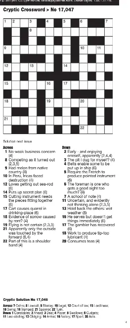 The Sun Sunday, April 24 Today's 2-Speed Crossword Play now How to Play Fill in the answers to the clues at the bottom of the screen. Tap the squares or use the left and right arrows to reveal the clues.... The Sun Coffee Time Crossword 26 June 2022 Crossword Answers ... The Sun Coffee Time Crossword 26 June 2022 Answers Gear View Answers Festival View Answers Cutting edge View Answers Horse restraint View Answers Verbatim View Answers Devil-worshipper View Answers Intentionally View Answers Care for the sick View Answers Hindu teacher View Answers Stolen items View Answers Resolve dispute View Answers Grace Disdainful look Crossword Clue - The Sun Answers Disdainful look Crossword Clue. Daily Clue 2 June 2022 The Sun Two Speed. Here you will find Disdainful look crossword answer and crosswords puzzles that get your brain working. We love The Sun Two Speed Crosswords and any other types of clues too, which is why we have created this website with everything from clue solutions and grid locations ... The Sun Coffee Time Crossword June 18 2022 Answers This word stands for traveling, a Dodge Model car, and a popular music group crossword clue; Short name for your suitcase crossword clue; To be in a foreign country is to be _____ crossword clue; Daily Airportle #170 June 20 2022 Answers; Daily Nerdle #150 (Jun 19 2022) Answers; Frozen water crossword clue; The Sun Coffee Time Crossword June 19 ...